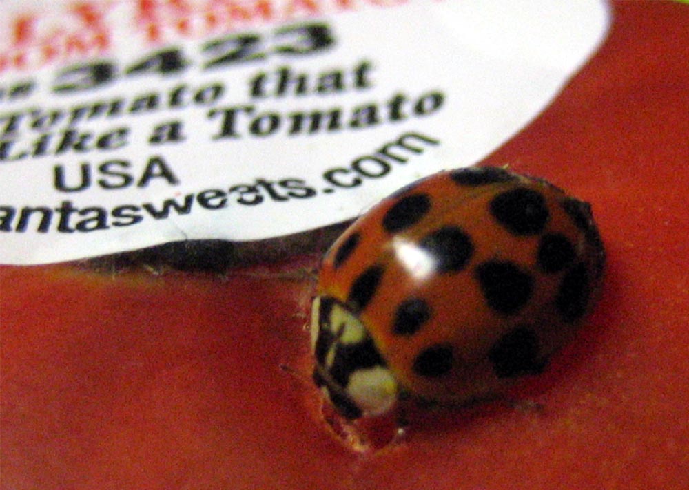 How about a picture? This was taken with my little digicam. The ladybugs around here love tomatoes. They'll attack the ones I leave on the window shelf in my kitchen within a day or two.